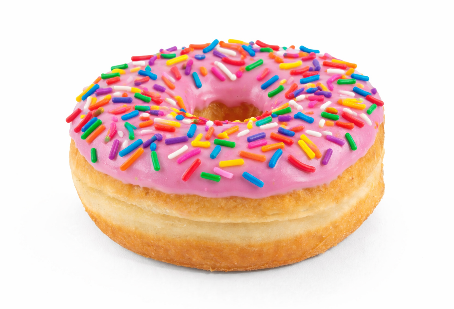 A classic 4” ring donut glazed with melt-in-your-mouth pink icing and topped with colorful sprinkles.